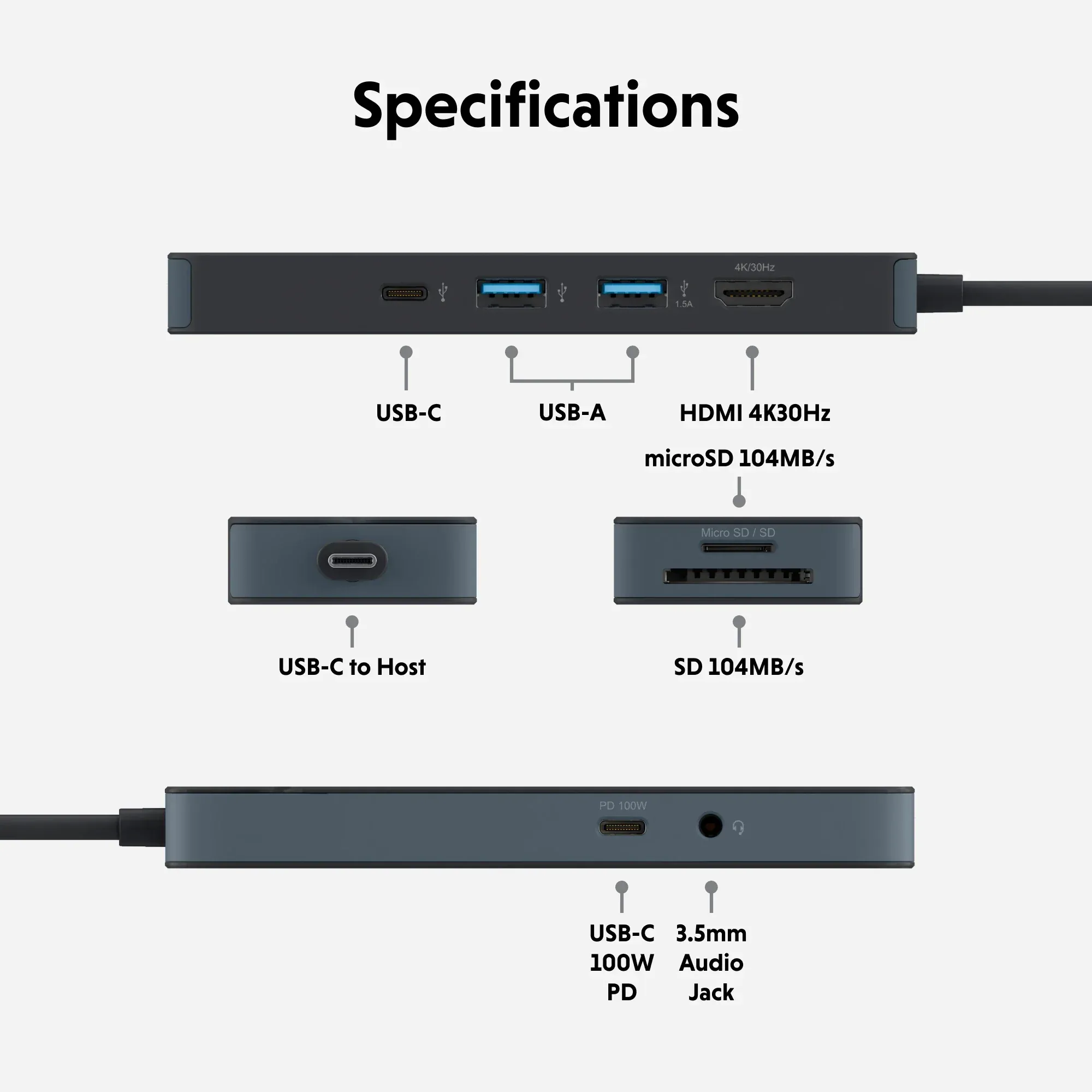 | Cổng kết nối | 1 × HDMI 4K@30Hz • 1 × USB-C PD 100 W • 1 × USB-C 5 Gbps • 2 × USB-A 5 Gbps • 1 × SD (104 MB/s) • 1 × microSD (104 MB/s) • 1 × Jack 3.5 mm |
